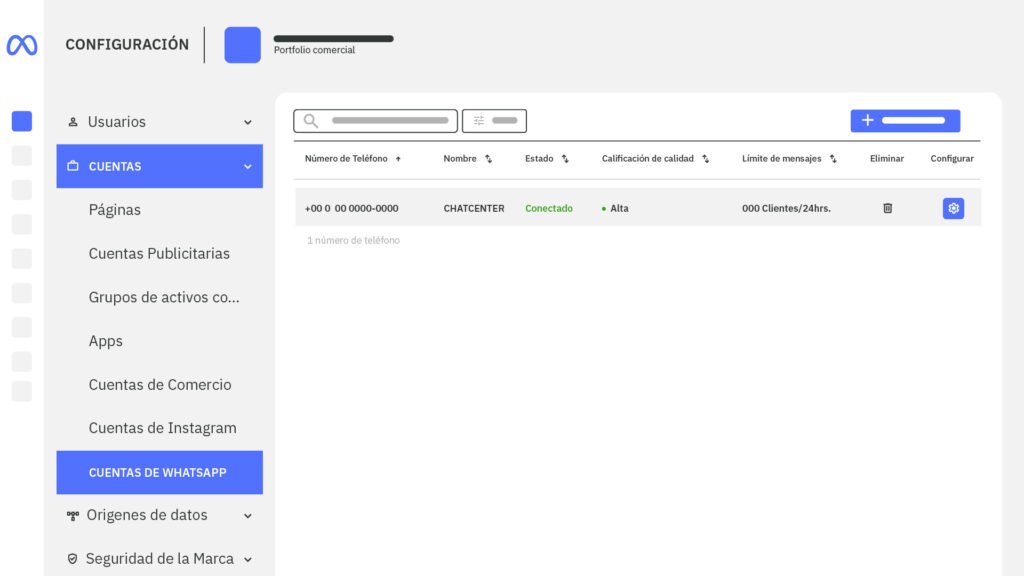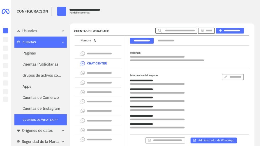 1. Haz clic en “Configuración” y luego en “Cuentas de WhatsApp”. Ahí elige la app de Empresa – Chat Center y después selecciónalo como “Administrador de WhatsApp”