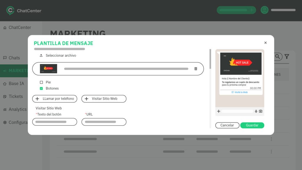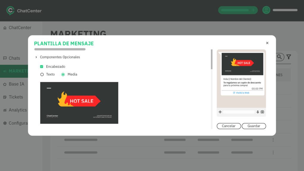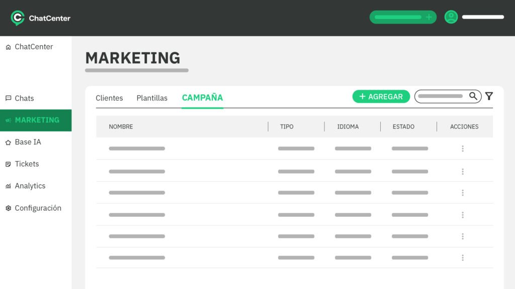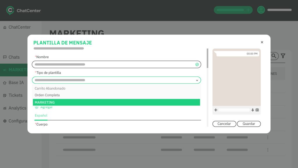 - Dentro de la plataforma de Chat Center https://app.chatcenter.net/#/system/login?redirect= ir a la solapa de Marketing y dentro de las plantillas hacer clic en agregar.