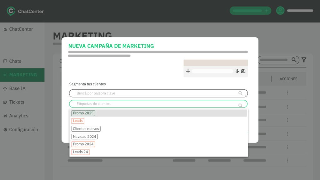 - Selecciona la etiqueta de clientes previamente segmentados para que tus campañas se envíen solamente a un limitado grupo. Si no eliges una etiqueta, tu campaña se enviará a todos tus contactos.