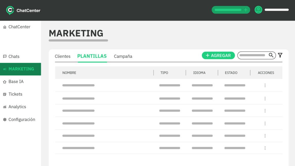 Accede a Chat Center y, en la sección de “Marketing,” selecciona “Agregar” para crear una nueva plantilla de mensaje.